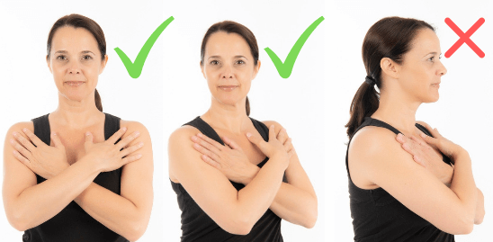 Un autre exercice consiste à pousser légèrement la tête contre la paume de la main posée sur le front, pour renforcer les muscles du cou. Ces mouvements doivent être réalisés deux à trois fois par jour, en douceur, sans provoquer de douleur supplémentaire.