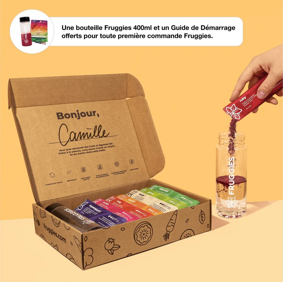 - Fondée en 2021, Fruggies propose des smoothies en poudre lyophilisés bio conditionnés en sticks individuels de 22 g.