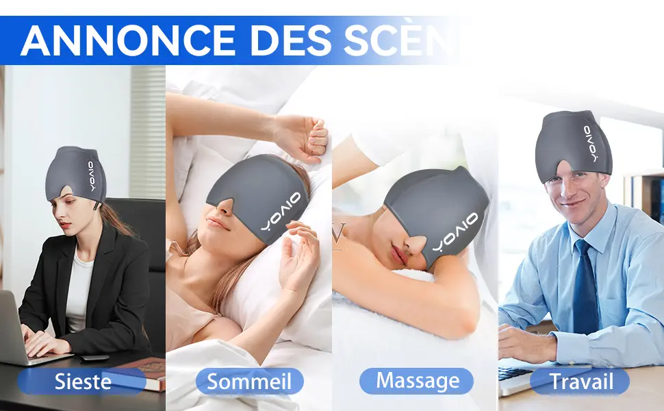 Le produit ressemble à une cagoule courte qui englobe le front, les tempes, le dessus du crâne et souvent une partie des yeux. Cette forme permet de combiner un effet compressif et une sensation de froid enveloppant, ce qui explique pourquoi ce format revient souvent dans les solutions non médicamenteuses.