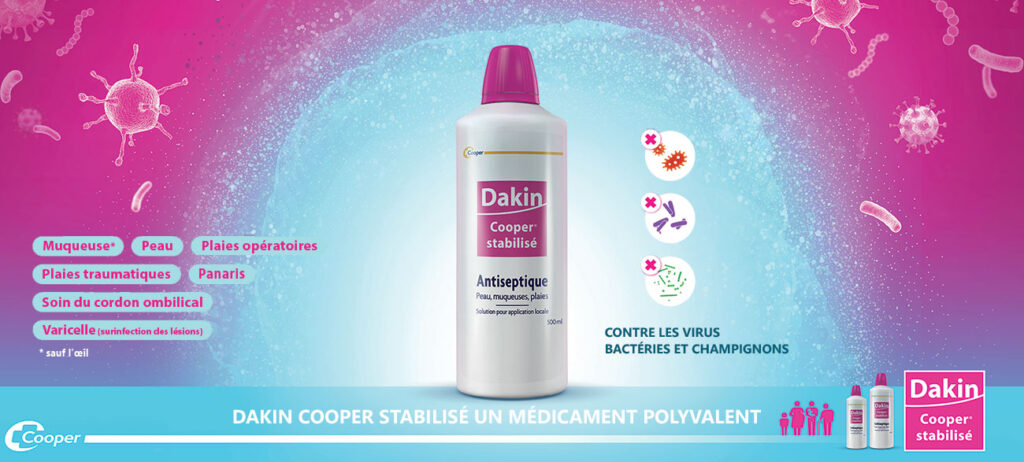 Le Dakin stabilisé a l’avantage d’être peu agressif, d’agir contre les bactéries, champignons et virus, et d’être bien toléré par les peaux sensibles. Il est particulièrement recommandé pour :